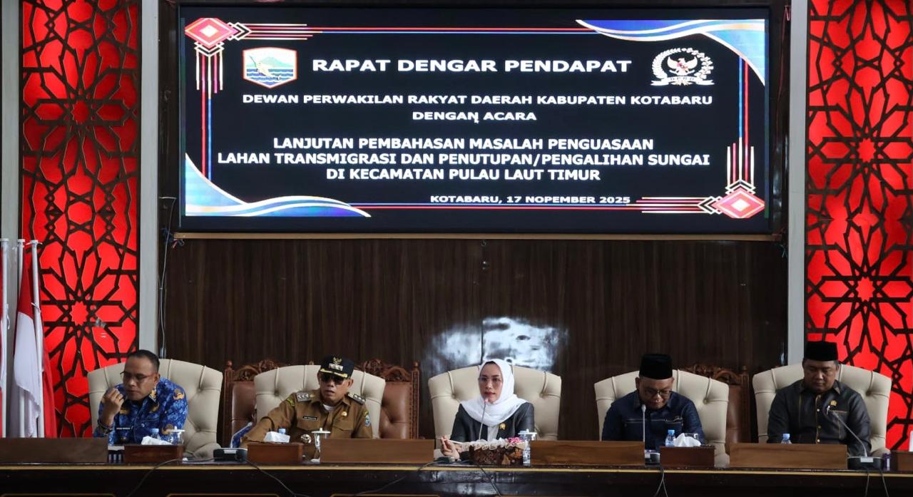 Kotabaru, Jukung.co.id — Pemerintah Kabupaten Kotabaru bersama DPRD Kotabaru menggelar rapat mediasi terkait persoalan lahan di wilayah Pulau Laut Timur, Senin (17/10/2025), di Ruang Rapat Paripurna DPRD. Pertemuan berlangsung intens dan dipimpin Ketua DPRD Kotabaru, Hj. Suwanti, dengan melibatkan unsur legislatif, eksekutif, instansi teknis, perusahaan, hingga perwakilan masyarakat.