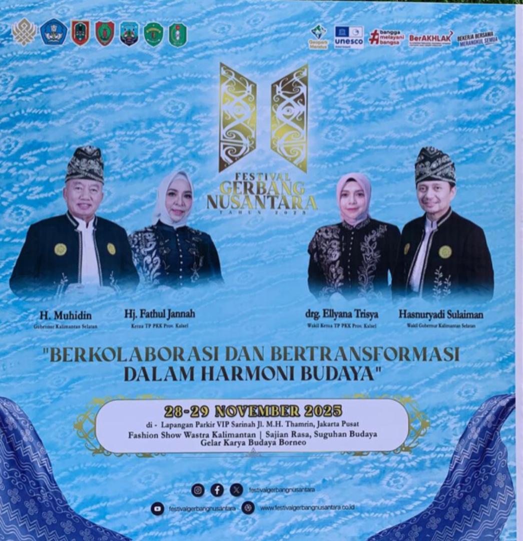 Jakarta, Jukung.co.id — Dinas Pendidikan dan Kebudayaan (Disdikbud) Provinsi Kalimantan Selatan menggelar Festival Gerbang Nusantara di Sainah Jakarta selawas dua hari, 28–29 November 2025. Beragam persiapan intensif dilakukan agar gelaran budaya ini berjalan sesuai harapan, termasuk gladi yang digelar jelang tengah hari Jumat (28/11/2025).