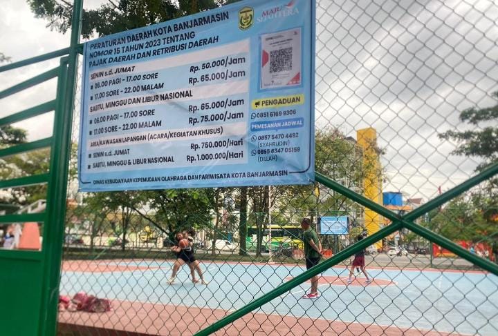 Lapangan basket yang berada di salah satu ikon wisata Banjarmasin itu diketahui dibangun dan direhabilitasi menggunakan anggaran daerah (APBD). Namun belakangan, di sekitar area lapangan terpasang spanduk berisi rincian tarif pemakaian yang mulai diberlakukan bagi masyarakat umum maupun kelompok olahraga.