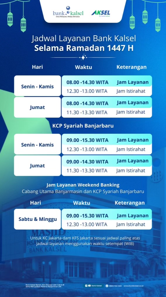 Dengan penyesuaian jam operasional ini, Bank Kalsel berharap pelayanan kepada nasabah selama Ramadan tetap berjalan optimal, sekaligus memberikan kenyamanan bagi masyarakat dalam melakukan aktivitas perbankan di tengah suasana bulan suci. (RLS/JCI).